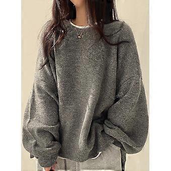 Fall/Winter Korean Style Minimalist Sweater Round Neck, Elegant Loose Fit Versatile Bell Sleeves Side Slit Pullover Knitwear For Women