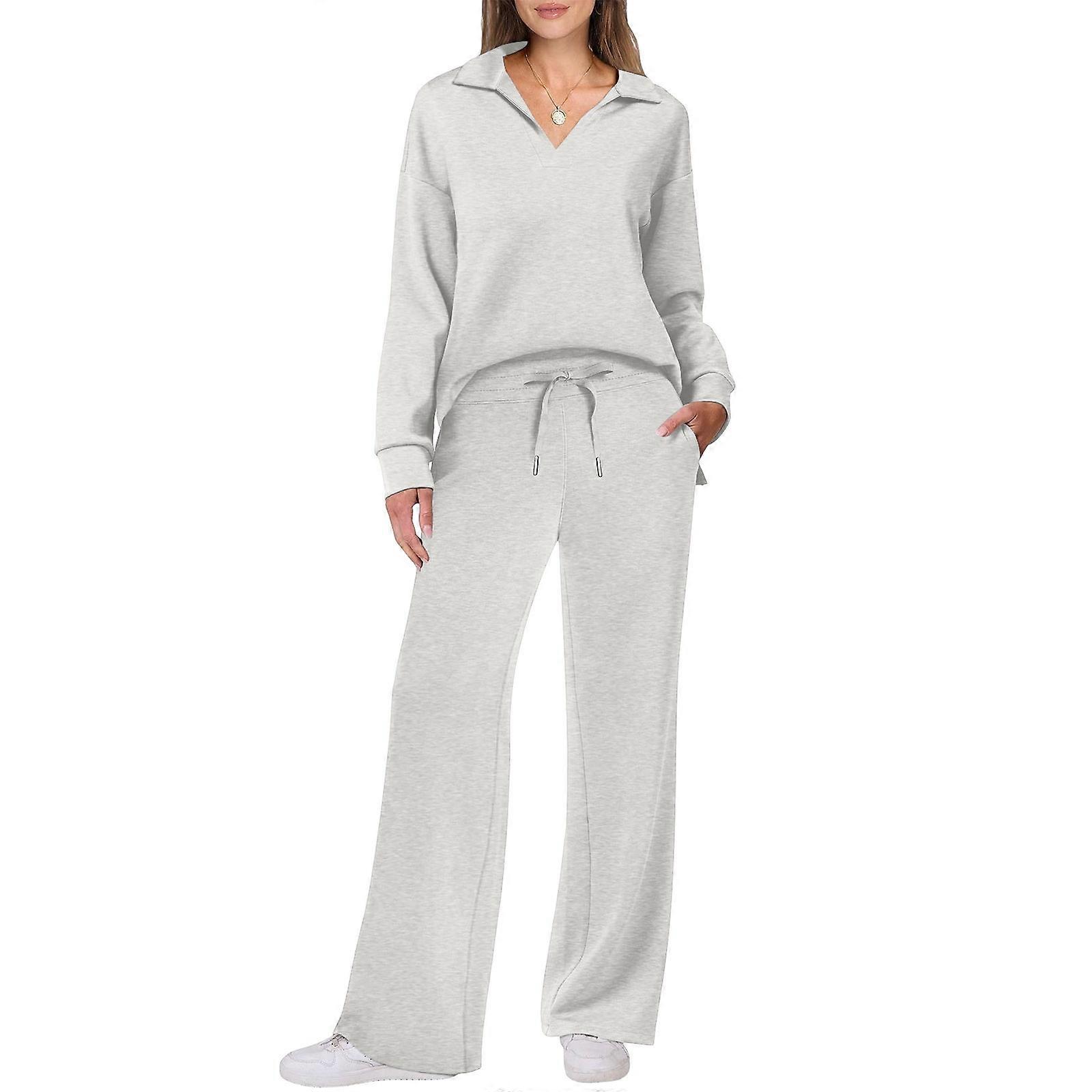 Travel 2 Piece Sets Women Casual Airport Fall Outfit V Neck Long Sleeve Tracksuit Wide Leg Sweatsuit White XL