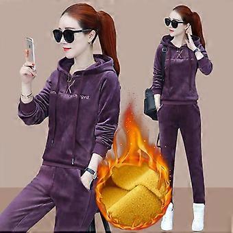 סטים של 2 חלקים מקטיפה עבה בחורף, סווטשירט מזדמן עם קפוצ'ון, תלבושת מכנסיים ישרים ומותניים גבוהים, חליפות אימונית חמה עם בטנה קטיפה