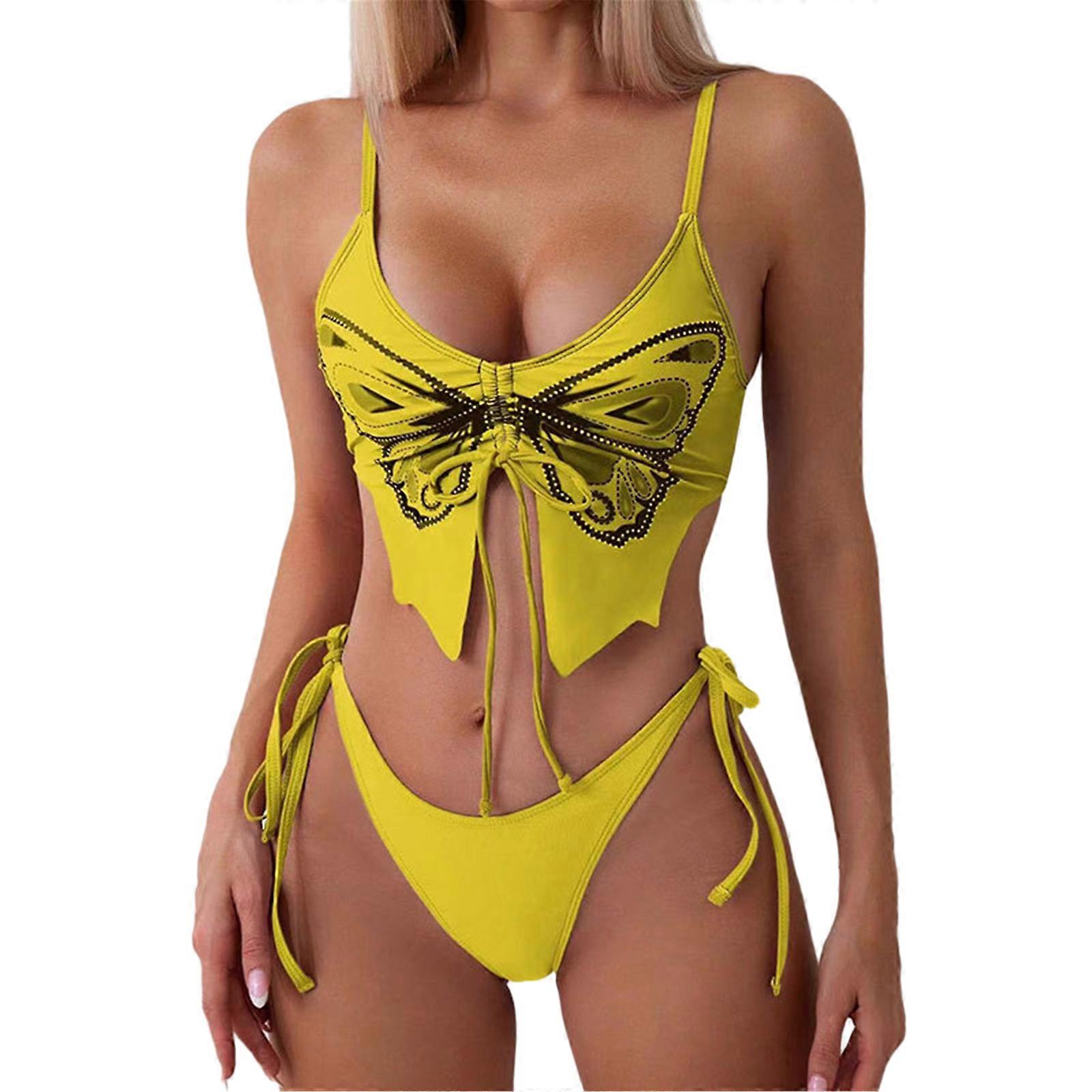 Butterfly Printed Bikinis Set for Women Summer Two Pieces Split Swimsuits Ladies Spaghetti Strap Bathing Suits Beachwear Yellow XL