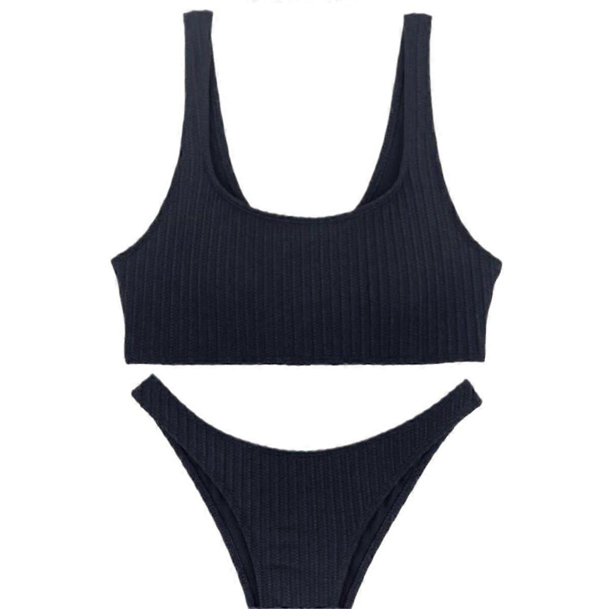 Black Ribbed Sports Bikini Set Square Neck Crop Top & High Cut Bottoms for Women