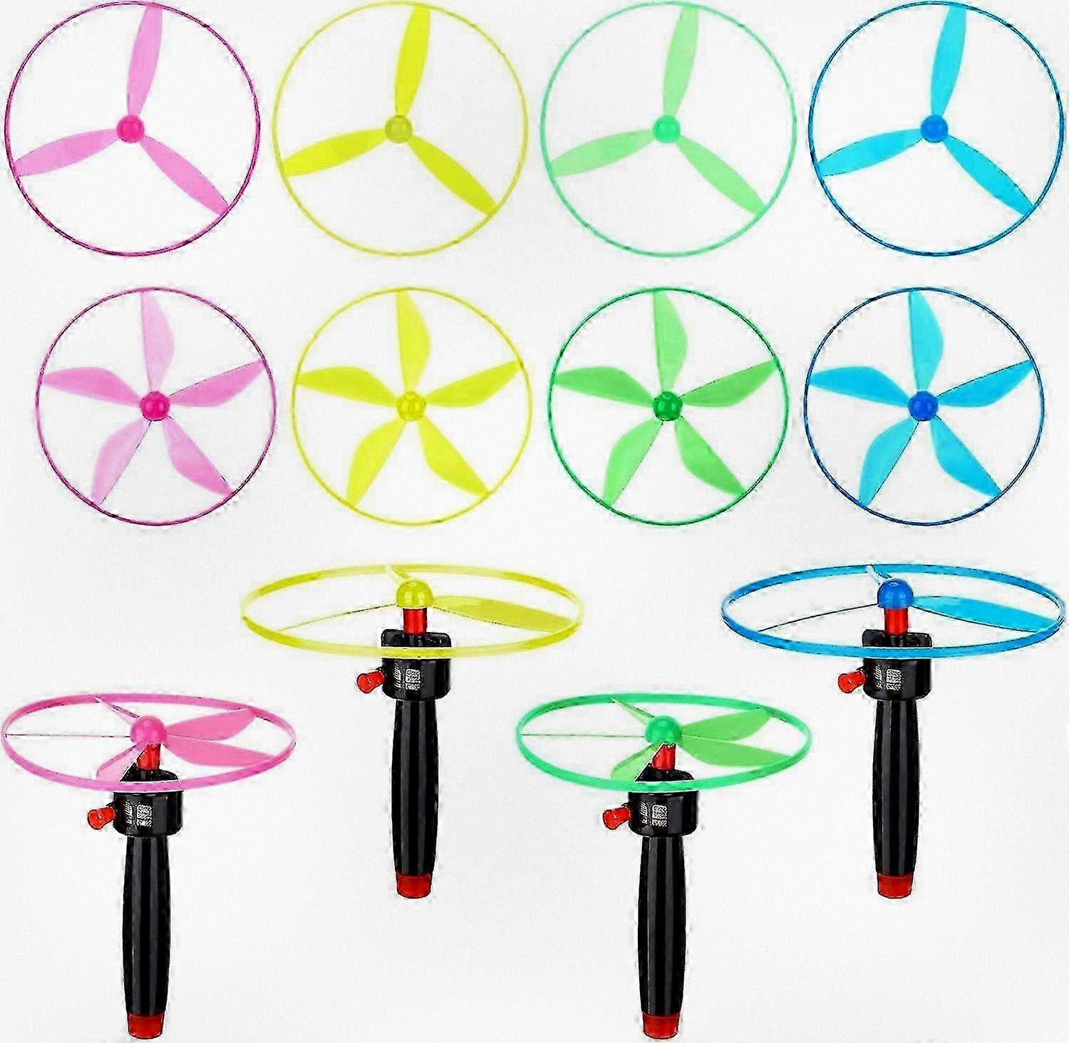 Package Content: You will get 12 pieces of flying toys, composed of 4 string launchers and 8 flying saucers with 2 sizes (each launcher is equipped with 4 flying saucers colors), simple and interesting to play, enough quantity for you to share with playmates Suitable Size: the launcher measures about 4.7 inches\/ 12 cm; The diameter of large flying disc is about 4.5 inches\/ 11.5 cm \/ , while small flying disc is about 3.9 inches\/ 10 cm , two different sizes of flying disc is enough for your daily use High Quality MaterialThis flying disc toy set is made of plastic, safe and quality, let you play for a long time Simple and Fun: put the saucer on the top of the flying disc launcher, there is a red pull wire at the launcher, pull the wire to the right position, it can fly very high, easy to operate Multiple Use: the flying saucer toy and disc launcher replacement are made in appropriate sizes, so they are easy to carry out, and can be played unlimitedly in the lawn, garden, backyard, seaside, beach, indoor, amusement park and other places