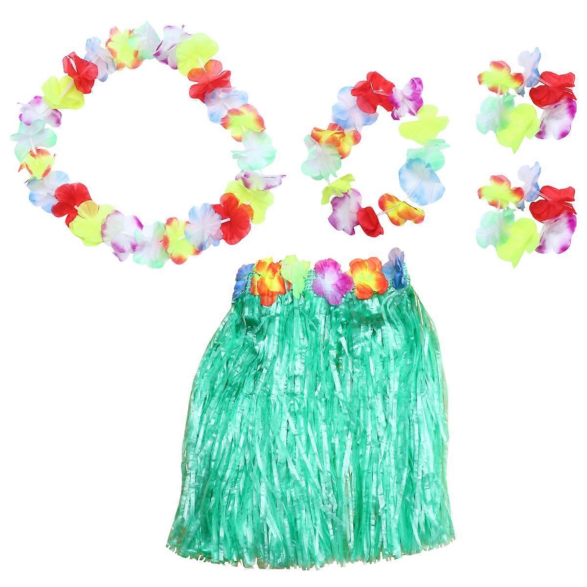 Hawaiian Style Skirt Set Simulation Flower Headdress Bracelets Hanging Garland Party Costume Accessories (Green)