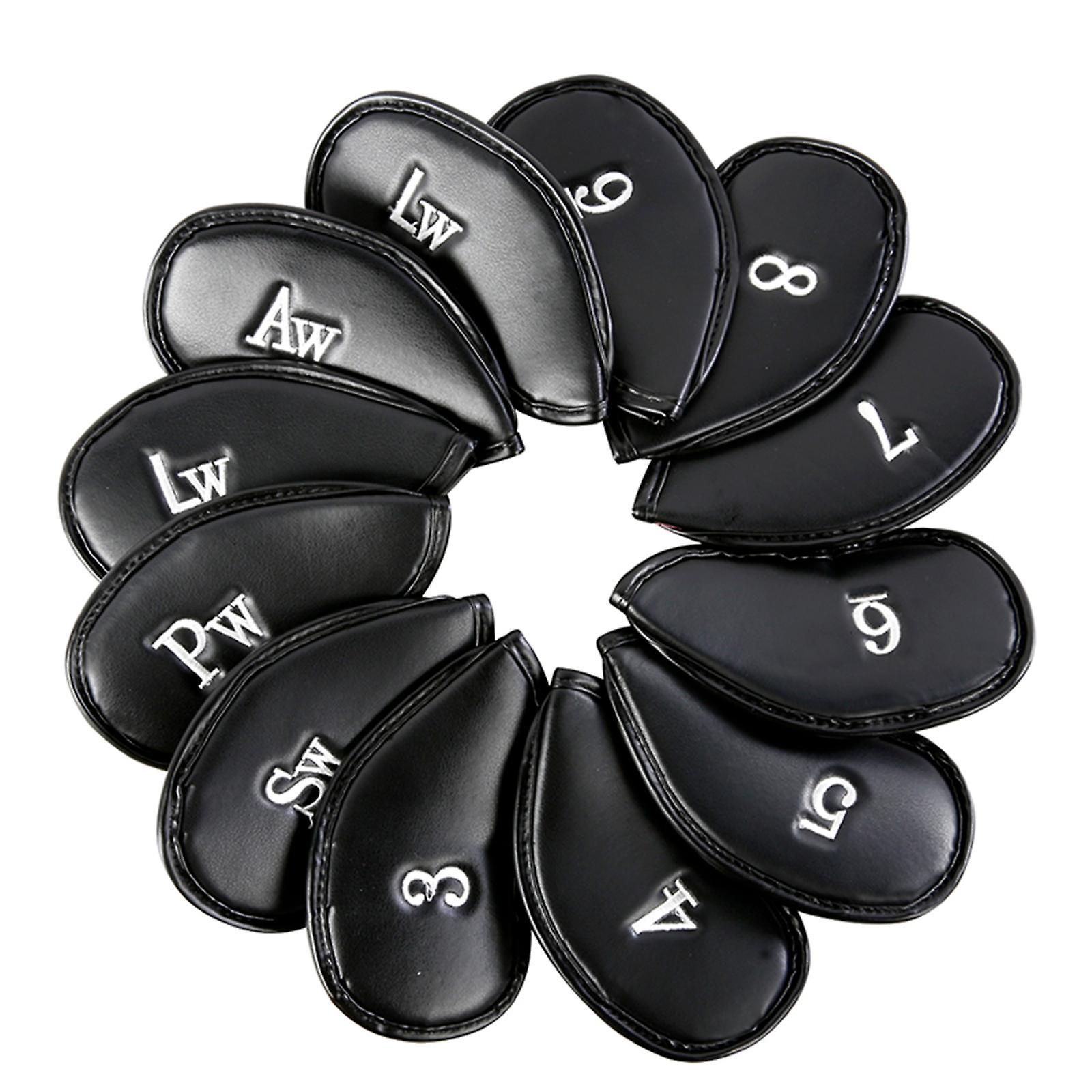 Description: Package Include: Pack of 12 pieces golf irons headcover protector (3, 4, 5, 6, 7, 8, 9, Sw, Pw, Lw(2pcs), and Aw). Perfect gift for your friends who is the golf lover.Durable Material: Golf iron head covers are made of high quality PU leather surface, waterproof, durable for long time use, with sticky closure, will not drop from iron head.Protect Golf Club: Golf club covers help keep your clubs clean and keep your golf iron head from scratching and damaged during outdoor travel or playing on the course.Easy to Identify: Golf irons headcovers with exquisite embroidery number/letter, easy to read and makes covers more stylish and can be a cool present for golf enthusiasts.Fits Most Clubs: Our iron head covers fit most brands of golf clubs and are easy to apply. You can easily put them on or take them off. Specification: Material: PU Leather Size Chart: 18cmx9cmx12cm/7.09inchx3.54inchx4.72inch Package Includes: 12 Golf Club Head Covers Note: Please allow slightly errors due to manual measurement and different monitors.