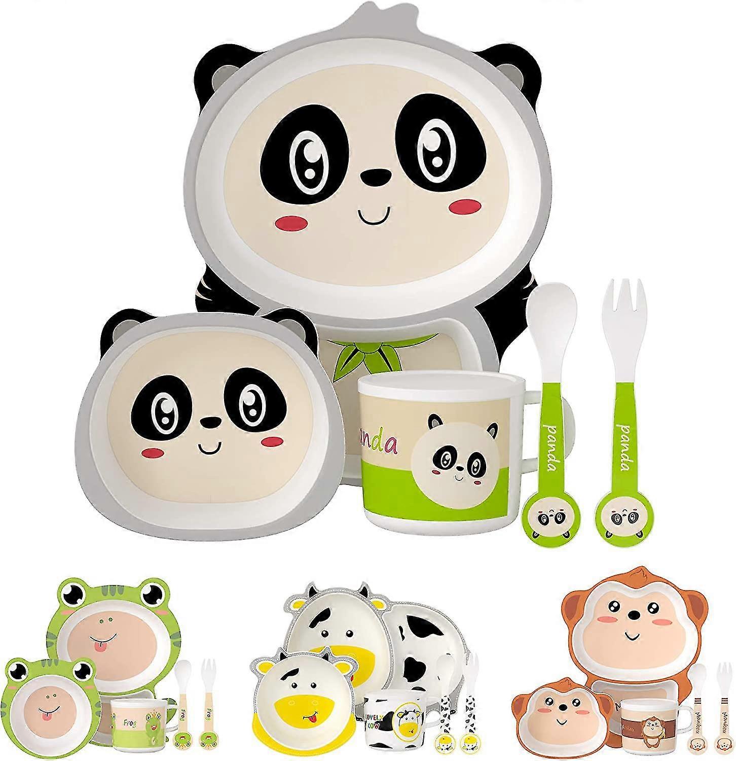 MATERIAL - Bamboo fiber. 100% Natural without Non-added. 100% Safe and Degradable. Cannot be used in the oven and microwave. EASY TO WASH - After cleaning, it is better to sterilize the dishes in boiling water for 3 minutes. Fragile object, cannot be used in the dishwasher. 5-PIECE TABLE SERVICE - A plate + a bowl + a cup + a spoon + a fork. A VARIETY OF STYLES AVAILABLE - Flamingo, panda, dinosaur, monkey, deer, frog, cow, etc., very suitable for children as gifts. Product description Color: Panda 5 Piece Table Service - Complete 5-piece table set special for children. - Many cute styles, nice colors, size fits well. - versatile, robust, resistant and colorful ideal for childrens birthday parties. Parameter - Material: 100% Natural Bamboo Fiber - Recommended age: 6 months + - Temperature: 0-100 - Size: shown in the picture - Package dimension: 26.5 * 21.5 * 10cm Notice Do not put in the oven, microwave and dishwasher, please Content and delivery 1xPlate, 1xBowl, 1xMug, 1xSpoon, 1xFork