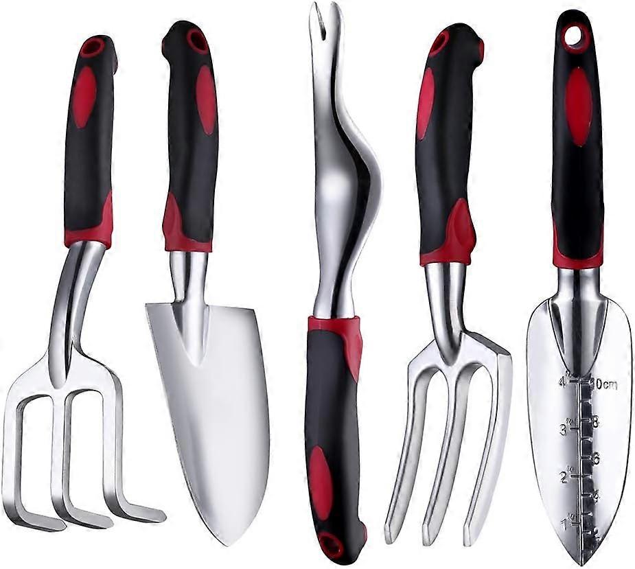 Garden Tool Set, 5 Piece Aluminum Heavy Duty Gardening Gifts Tool Set with Non-Slip Rubber Grip for Men and Women (Black/Red)