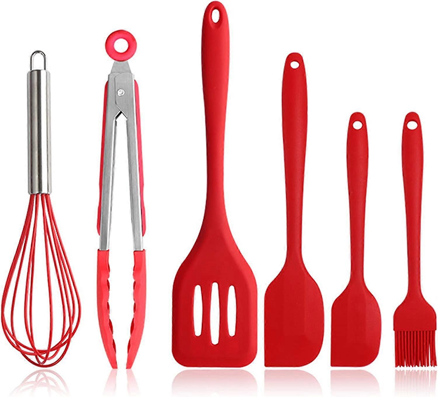 Material: The spatula set made of food grade silicon does not emit chemical smell or other harmful toxins, BPA free, non-toxic cookware and non-stick High heat resistance: heat resistant up to 446 C (230 C). The highest temperature of the pan is generally never more than 200 C. You can use it to stir or mix and do not worry about the spatula melting. Protect Cookware: Perfect kitchen spatula tongs for cooking, serving, grilling, buffet, salad, ice cream, baking. You will find how practical it is STAINLESS STEEL INTERNAL: Each silicone spatula receives stainless steel for extra strength. It does not melt, discolour or warp like a typical plastic spatula or silicone spatula. Package: baking tools 6 pieces - 1 x slotted turner, 1 x large spatula, 1 x small spatula, 1 x cup brush, 1 x egg whisk and 1 x tongs