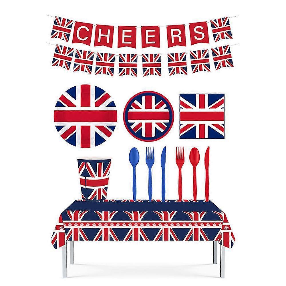 Union Jack Tableware Set, Union Jack Themed Paper Plates, Cups, Napkins British Flag Banners, Tablecloth, Knives, Forks, And Spoons Party Decor