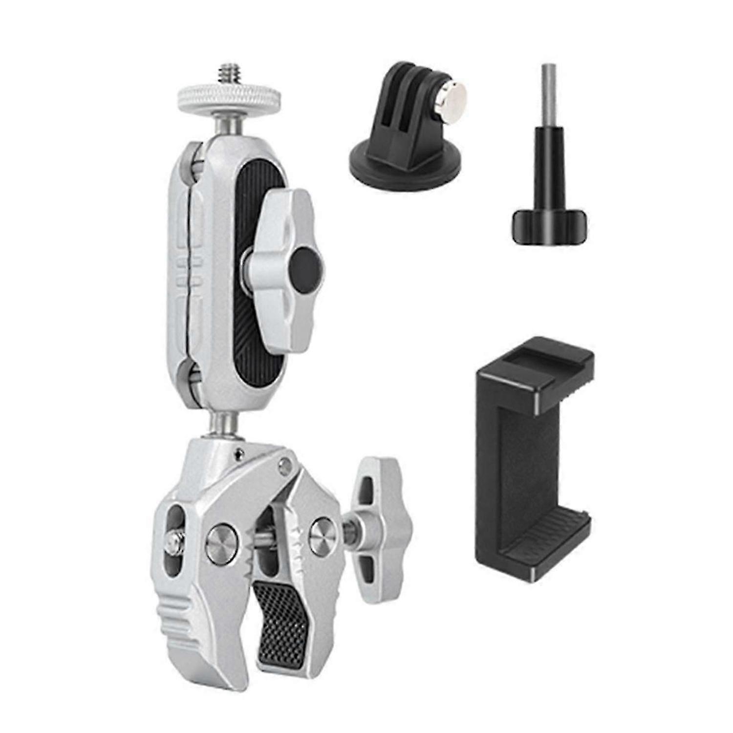 Double ball design, 360 universal adjustment angle Various scenes, desktop stand, bicycle stand, railing stand, etc. Aluminum alloy material, aluminum alloy material is safe and stable Product name: Multifunctional strong pea clamp Applicable clamp distance: 10-50mm<br><br>Product load-bearing capacity: 1.5KG One end can be installed with a 1/4 inch screw to install the display and LED light or monitor or camera, and tighten the clamp by tightening the knob to lock the rod on the cage. Compatible with various devices SLR adapter Most SLR cameras on the market Compatible with compact cameras Most compact cameras on the market Mobile phone Can be connected to a mobile phone with a straight clip Sports camera Can be connected to a sports camera with an adapter Material: Aluminum alloy colour: Silver<br><br>Package Contents: 1 x Sports camera bracket set<br><br>Only the above package content, other products are not included. Note: Light reflection and different displays may cause the color of the item in the picture a little different from the real thing. The measurement allowed error is +/- 1-3cm.