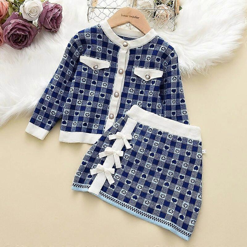 Kids Sweater Set Autumn Long Sleeve Knit Set Kids V-Neck Little Bear Printed Knit Top+Pleated Skirt Two Piece SetKIDS Outfit Sets