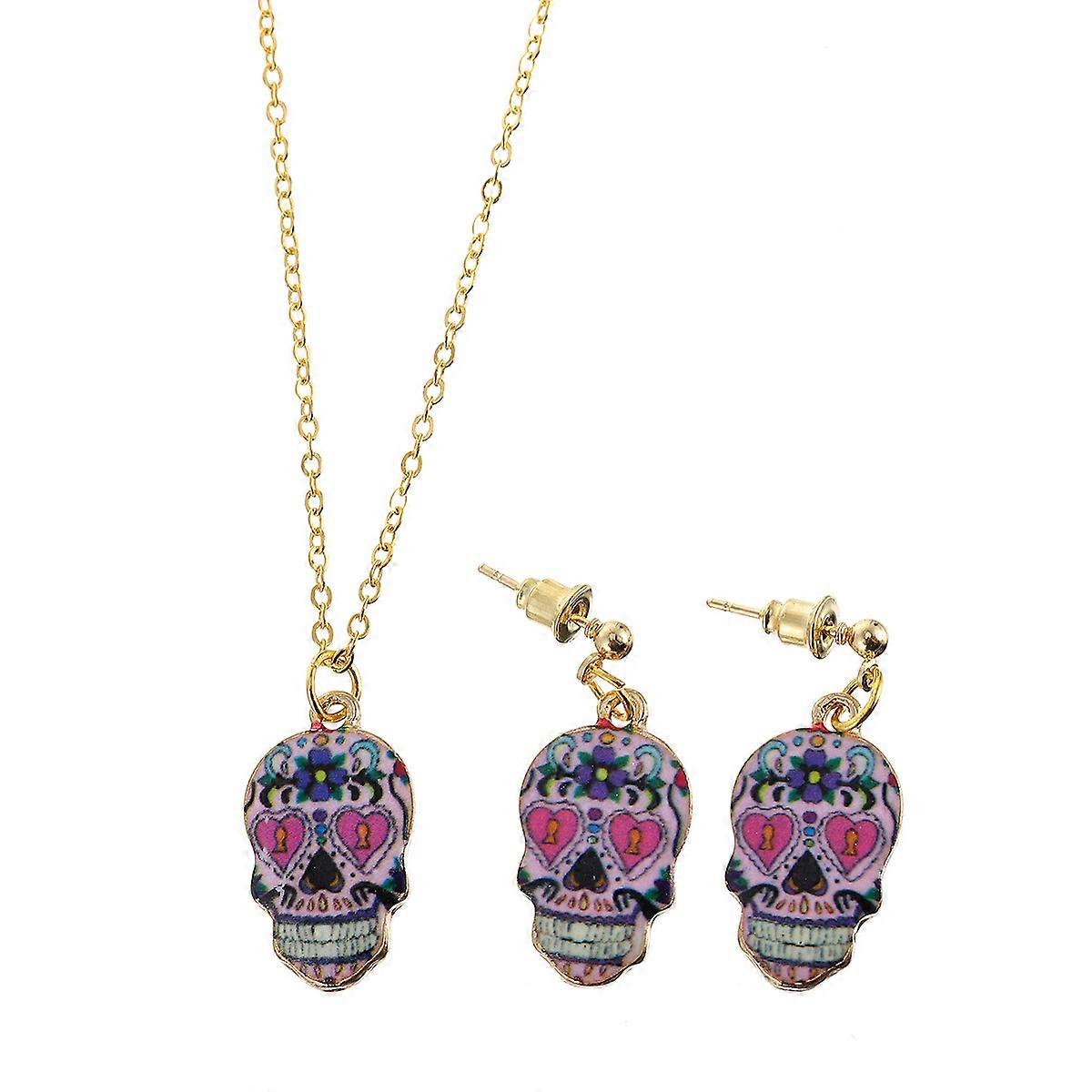Skull Patterned Necklace Earrings Set for Women Halloween Theme