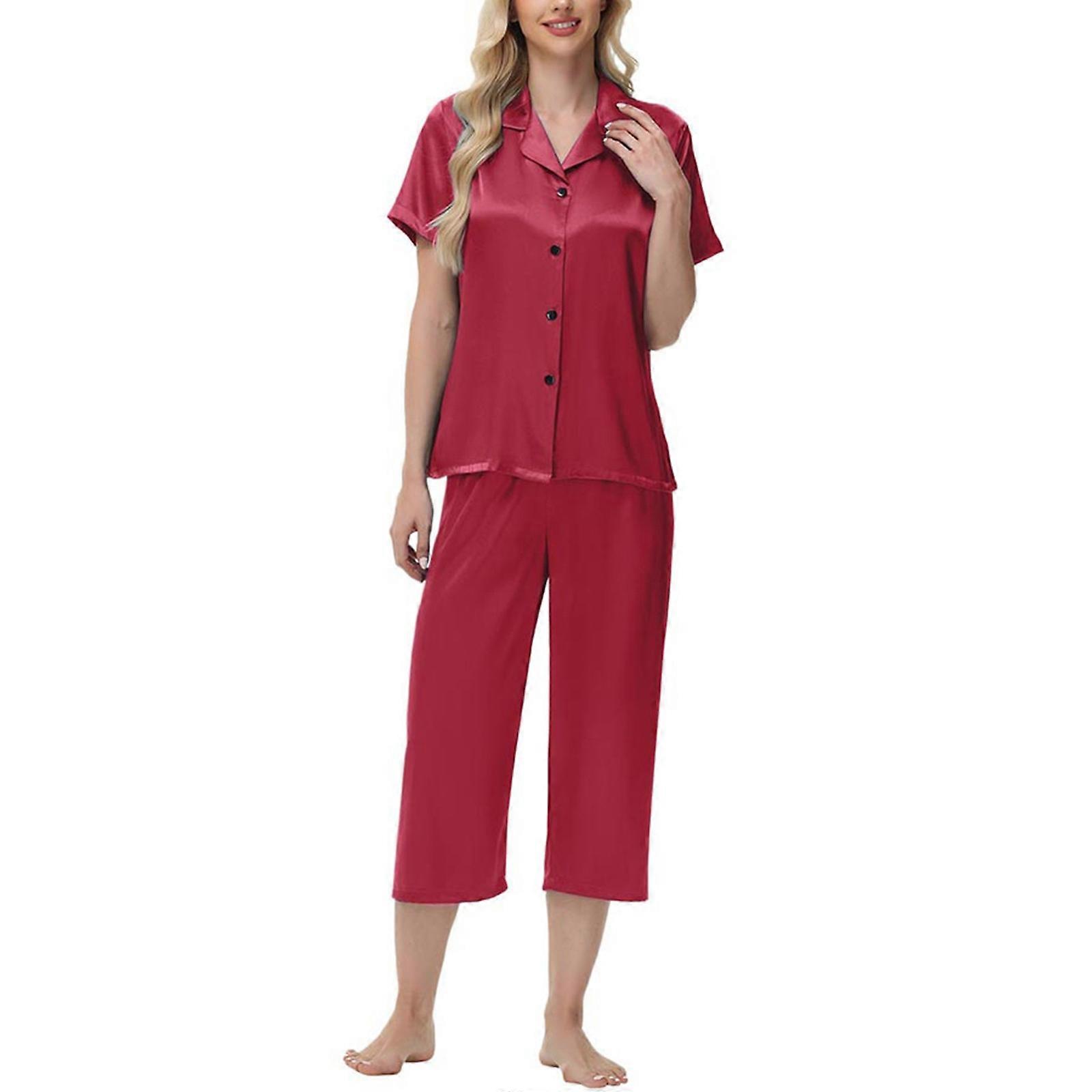 Women's Ice Silk Satin Pajama Set, Short-Sleeved Capri Pants, Women's Home Wear Burgundy XL