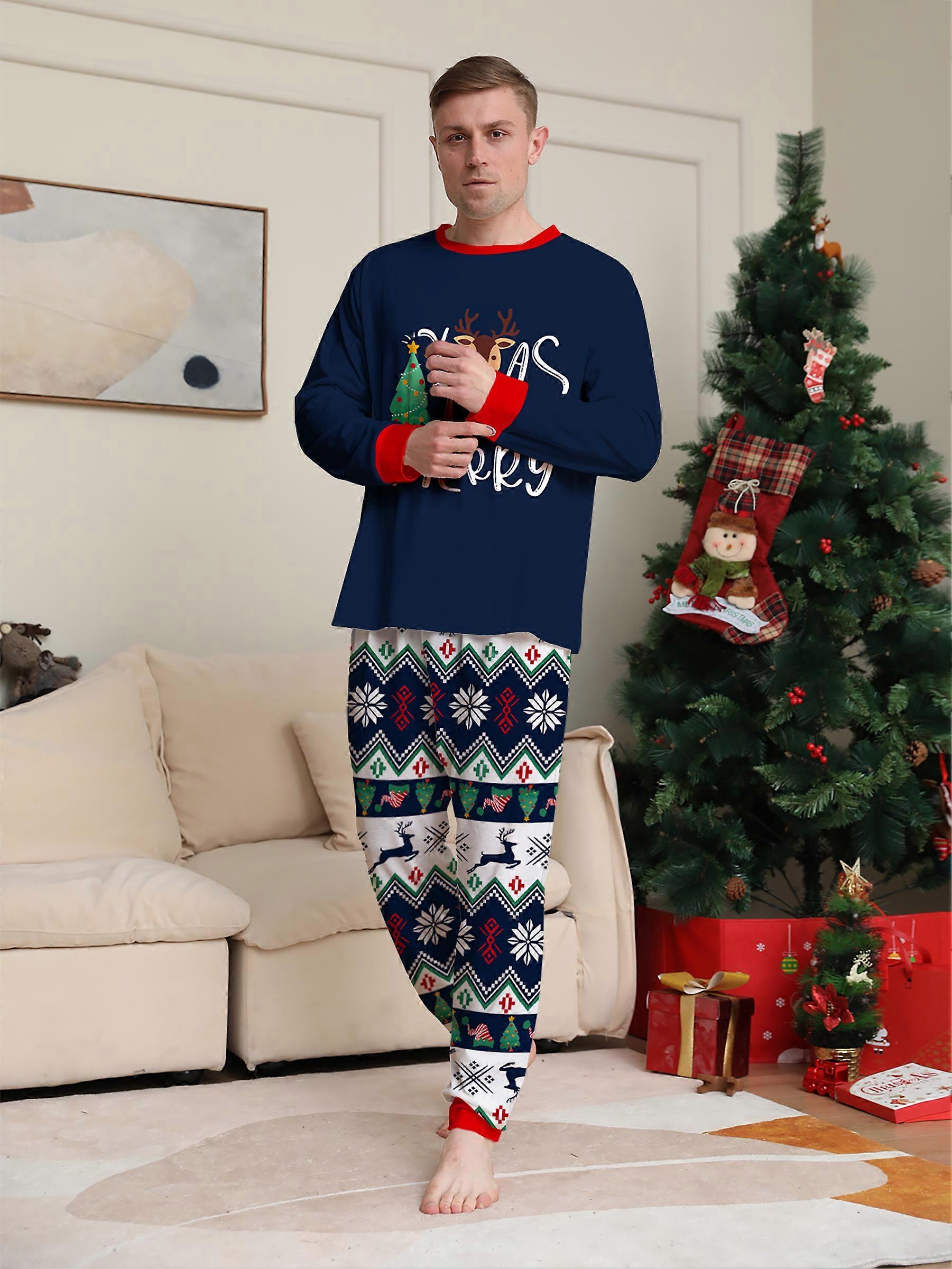 Christmas Couple Pajamas Set "Xmas The Merry" Reindeer Christmas Tree Print Navy Top & Multi-color Tribal Pants Sleepwear