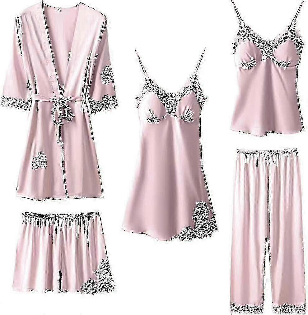 25-26 Women's Luxury 5 Piece Silk Pajama Set - Cami Shorts Nightgown and Robe