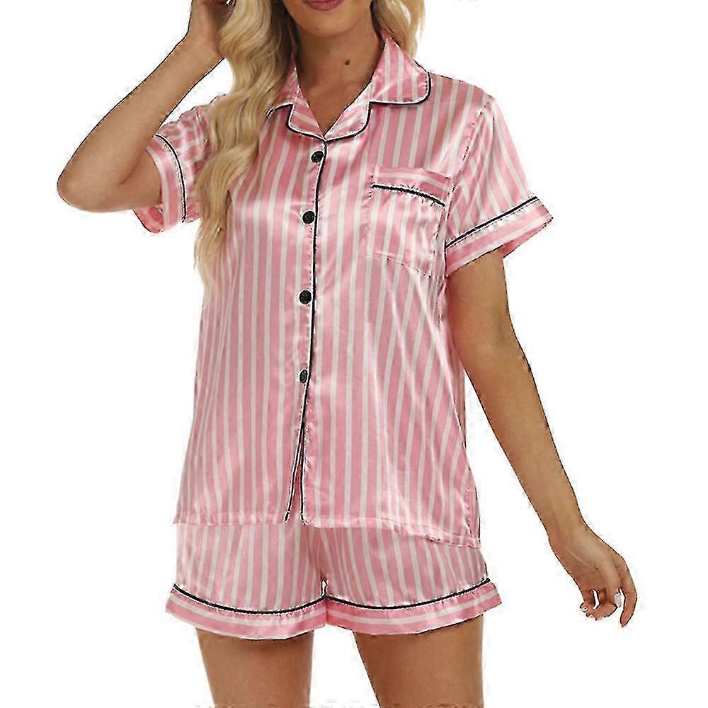 Weight: 250g. Material: Polyester. Color: Pink. Package Content: 1 Set Of Pajamas. Occasion: Family. Soft and lightweight satin material, this pajama set is comfortable for your day or night relaxation. Two-piece satin pajama set features a button front short sleeve shirt and a pair of shorts. Notch collar short-sleeved top with chest pocket, button closure and piping trim. V-Neck printed pajamas with stripes. Printed elastic waist shorts with a loose fit. Women's casual summer pajama set with shorts. Casual two-piece satin pajamas set, suitable as loungewear, pajamas, or casual wear. Good gift for wife, mother, or daughter for Christmas, New Year, or birthday.