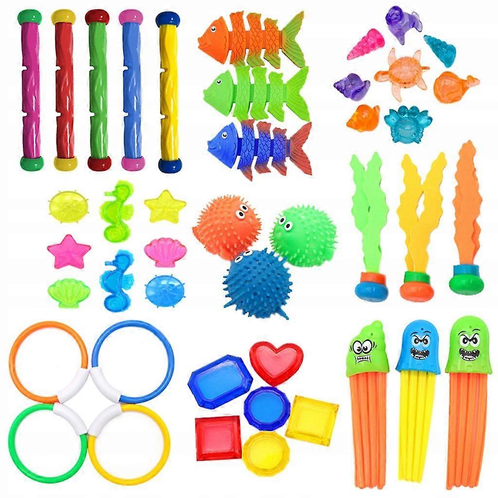 Plastic Diving and Diving Set Summer Fun Pool Toy 43 Pcs A Description: These diving toys are sure to bring your little ones a lot of fun, provide them with a cool summer and encourage them to practice their swimming skills in the pool or on the beach. Each package includes diving rings, water bandits, diving gems, diving seaweed and small marine animals, etc. Made of the highest quality material, all toys with smooth surface and no sharp edges and burrs, very safe for children to play with. It provides an excellent way to train your dive, just throw them in the pool, wait for them to sink to the bottom, and then follow them. Perfect as pool party toys, bath toys, beach swimming toys, fantastic. Specification: Material: Size Chart: Diving Rod Size: 18x2.6 cm/7.09x1.02 inch Diving Seaweed Size: 16x3.5cm /6.30x1.38 inch Diving Fish Rings Size: 20x14cm / 7.87x5.51 inch Fish Size: 12.5x3.3 cm/4.92x1.30 inch Clown Size: 10x7.5 cm/3.94x2.95 inch Octopus size: 12 cm/4.72 inch Heart Gem: 3.8x3.5 cm/1.50x1.38 inch Round diamond: 3.2x3.2 cm/1.26x1.26 inch Rectangular Diamond: 4.2x3.1cm/1.65x1.22 inch Square Size: 3.1x3.1 cm/1.22x1.22 inch The package includes: Optional quantity 1 set of diving toys