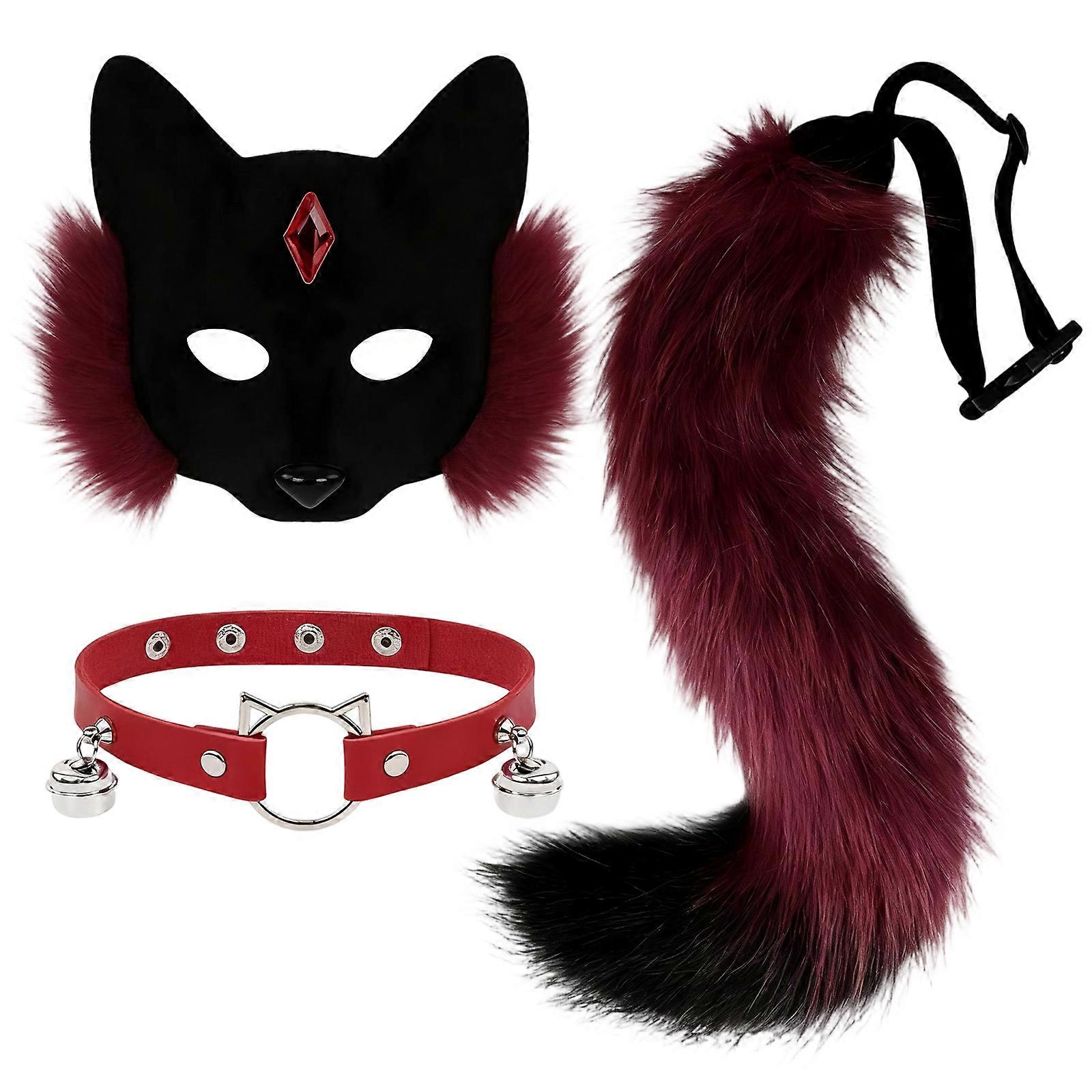 Plush Animal Mask Choker and Tail Set For Halloween Christmas Event Reusable Decoration Props Costume Accessory Red