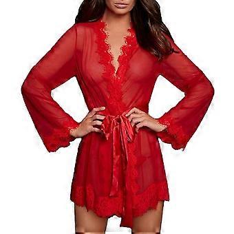 Underwear Dress Set See-through Lace Cardigan Tight Waist Women Sleepwear