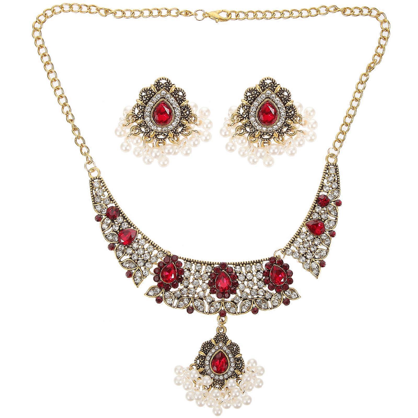 Vintage Earrings Necklace Set Pearls Rhinestones Pendant Chain Jewelry 18x14cm 1Set