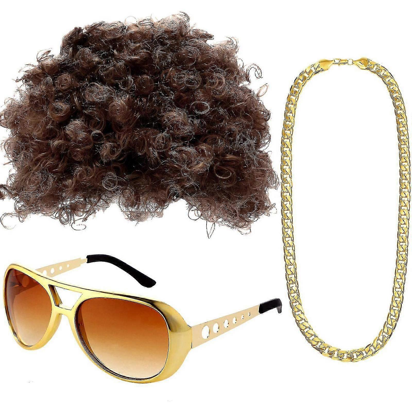 Costume Set Short Curly Afro Wig Sunglasses Faux Gold Necklace Fake Moustache For 70s Disco Party