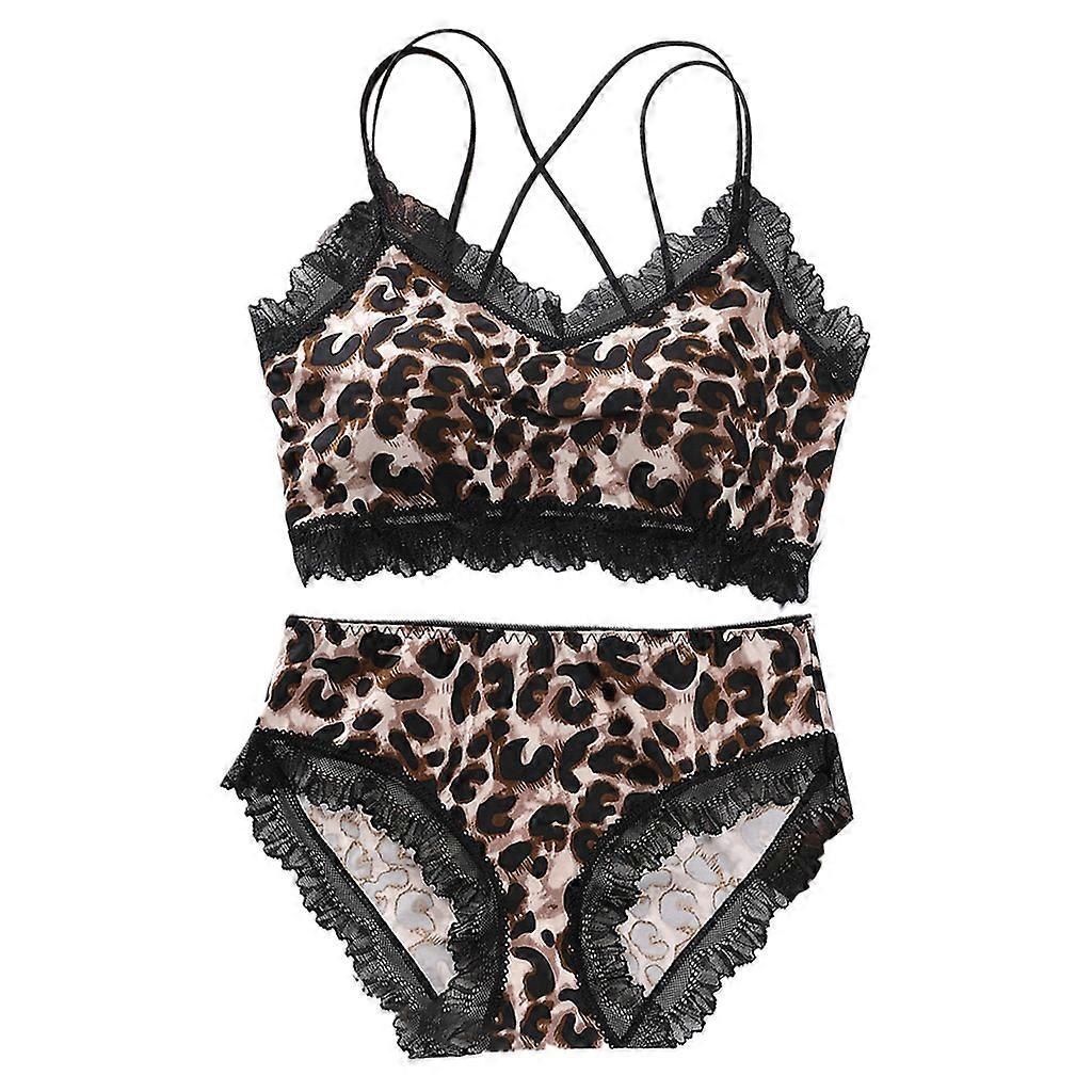 Womens Sexy Strappy Bandage Underwear Set Ruffles Lace Bra Panty Camouflage Leopard Padded Bralette Crop Top Lingerie Leopard