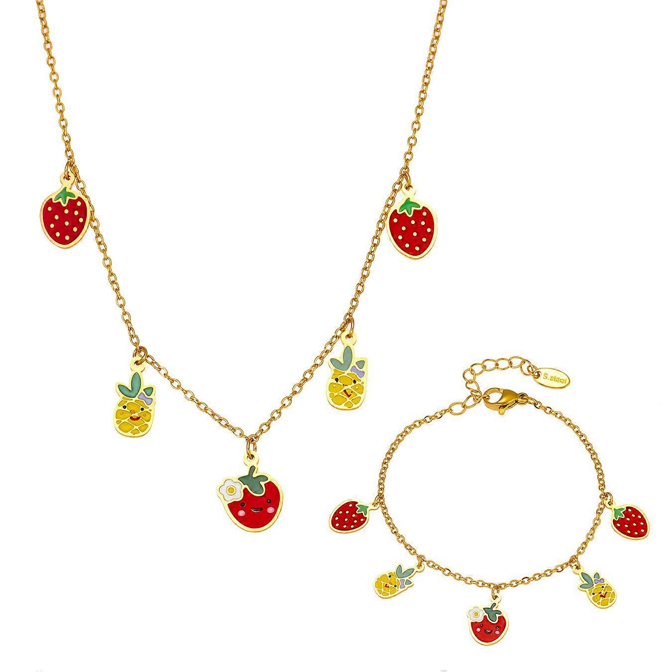 Kids Jewelry Set, Stainless Steel Fruit Shape Strawberry Pineapple Drip Oil Fade Resistant Necklace Bracelet Anklet