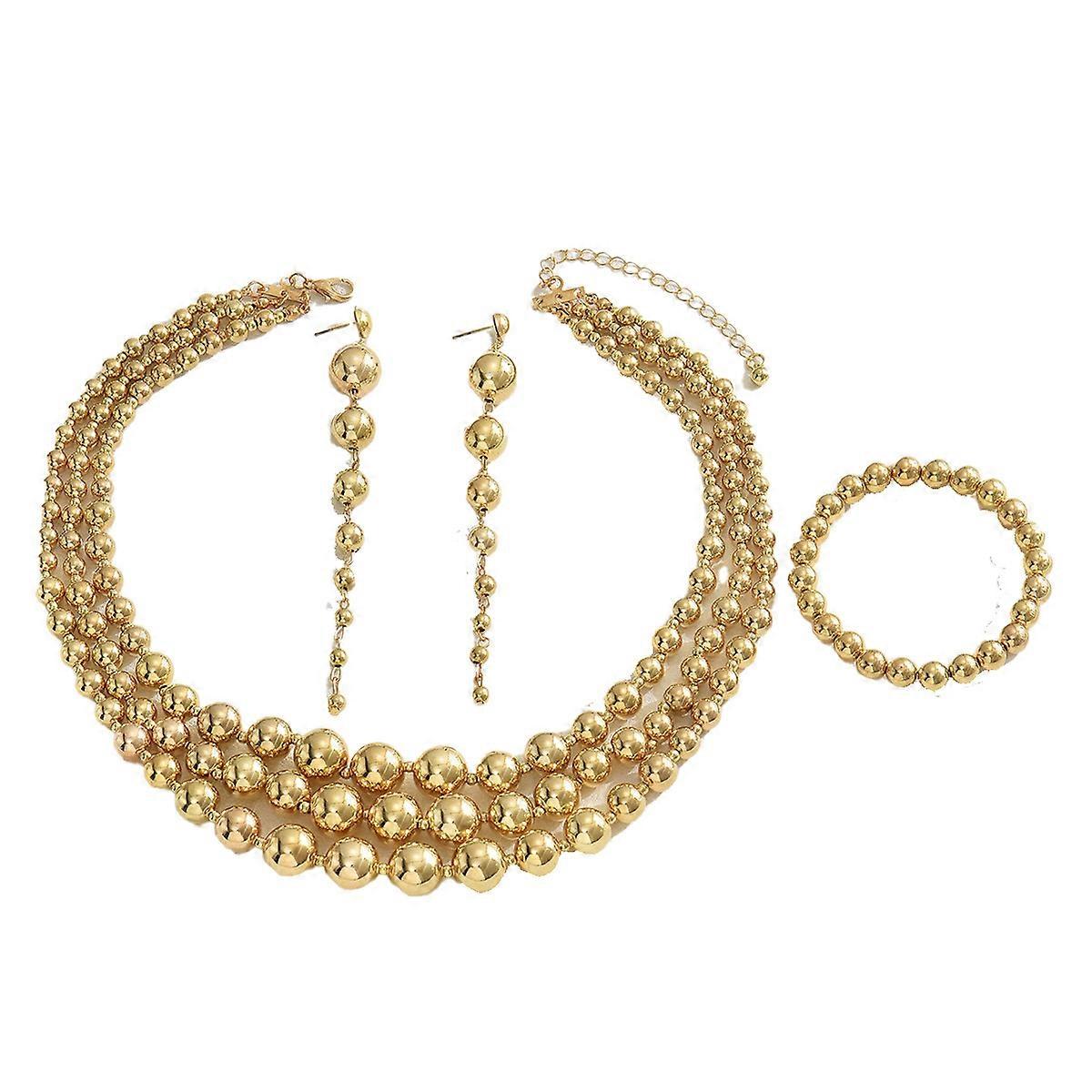 This jewelry set includes a necklace and earrings, designed with beaded and multi-layer collarbone chain elements for a trendy look. Made of alloy material with electroplated processing. Versatile style suitable for various occasions. Color as shown in the picture.