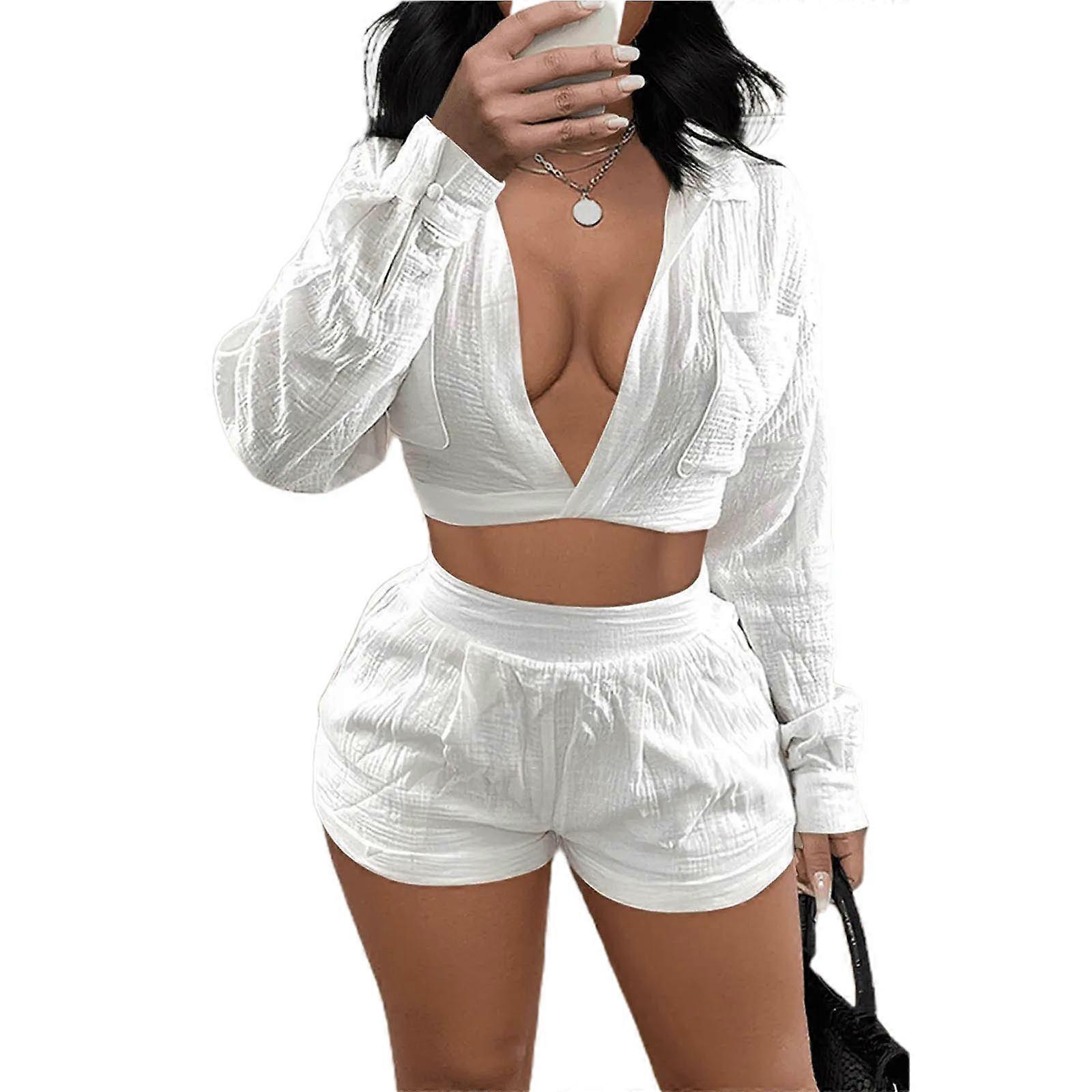 Womens Two Piece Casual Tracksuit Outfit Sets V-neck Long Sleeve Shirt And Loose High Waist Mini Shorts Set White XS