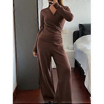 Women's Elegant Solid Color V-Neck Button Knit Sweater & Wide Leg Pants 2 Pieces Set, Autumn