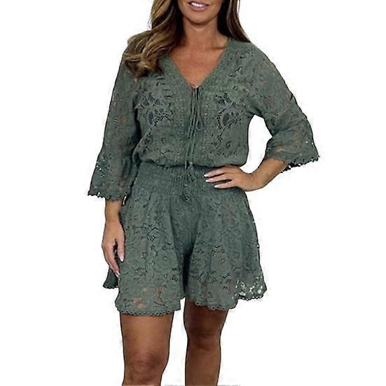 2 Pcs/Set Women Top Shorts Set Hollow Out Lace Flower Embroidery V Neck Drawstring Three Quarter Sleeves Elastic High Waist Loose Dating Commute