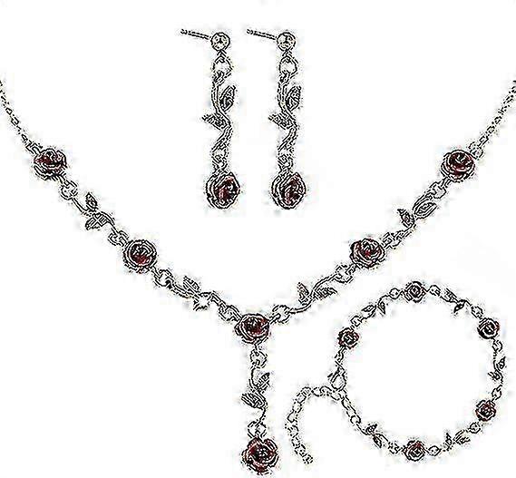 w 3Pcs Set Red Rose Jewelry - Rose Flower Pendant Necklace, Bracelet Dangle Earrings Bracelet Flower