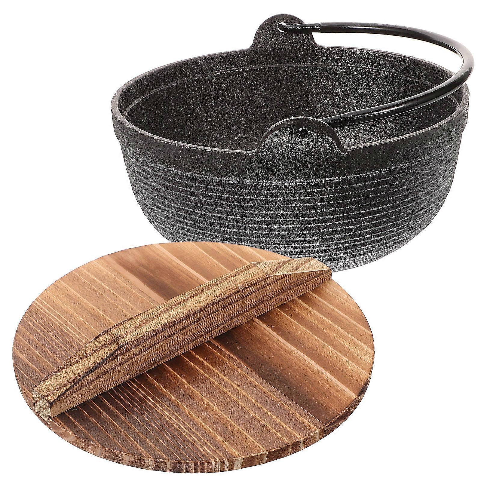 Japanese Style Cast Iron Serving Pot For Camping Picnics Round Shape Wood Lid 1Set