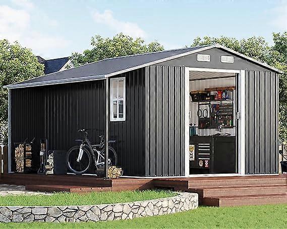 10.6 ft x 10.3 ft x 6.3 ft Galvanized Steel Storage Shed with Open Firewood Area, Sliding Doors, Ramp, Dual Windows, and Ventila