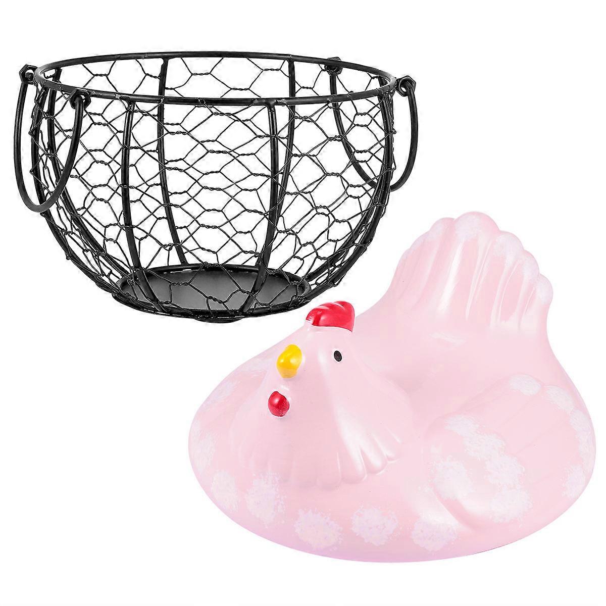 Compact Pink Iron Storage Basket with Hen Lid – Rustic Wire Organizer for Kitchen Pantry, Fruit, and Snack Storage