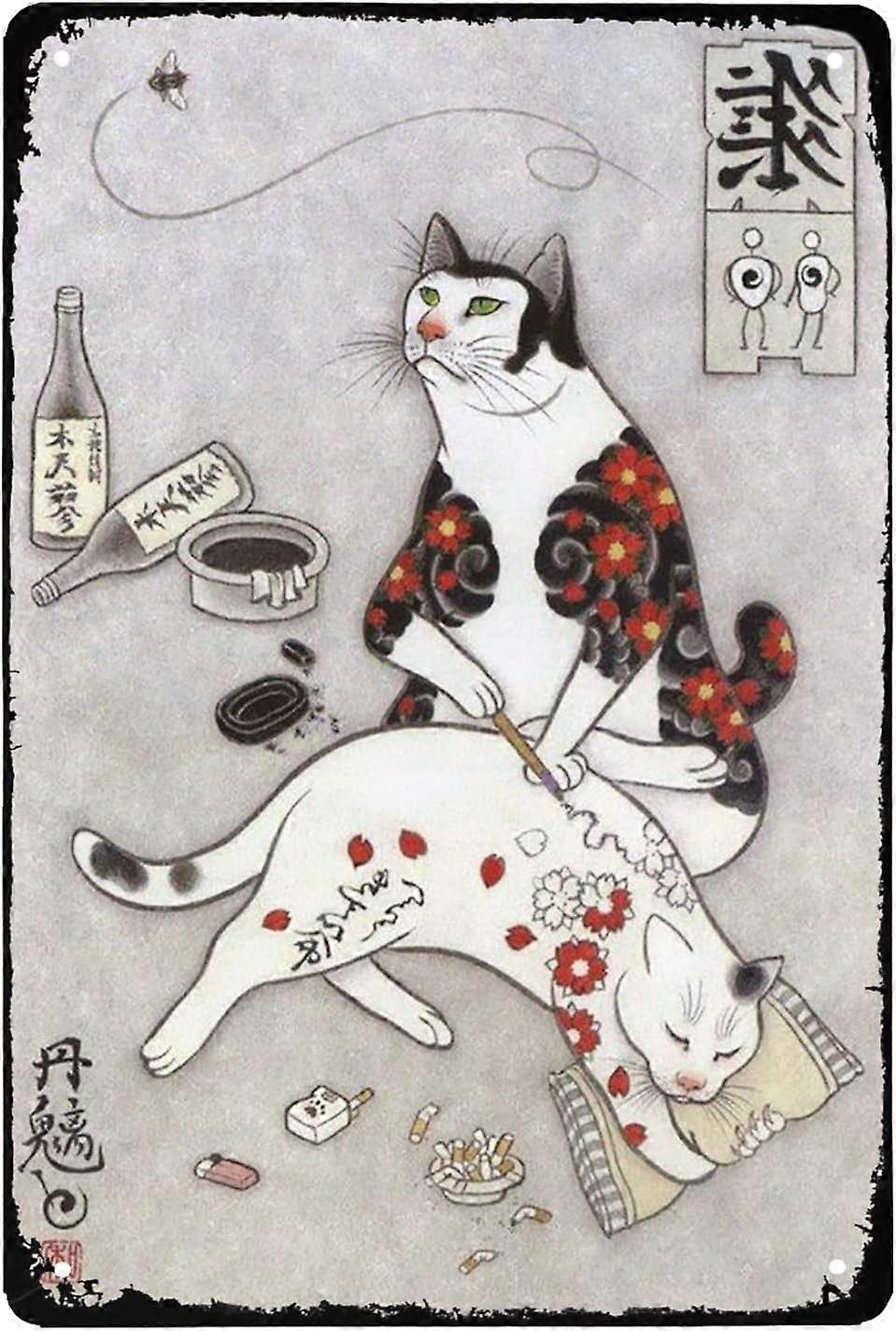 Funny Japanese Samurai Tattoo Cat Tin Sign Vintage Home Bar Cave Wall Decoration Japanese Art Tin Sign 8x12 Inch