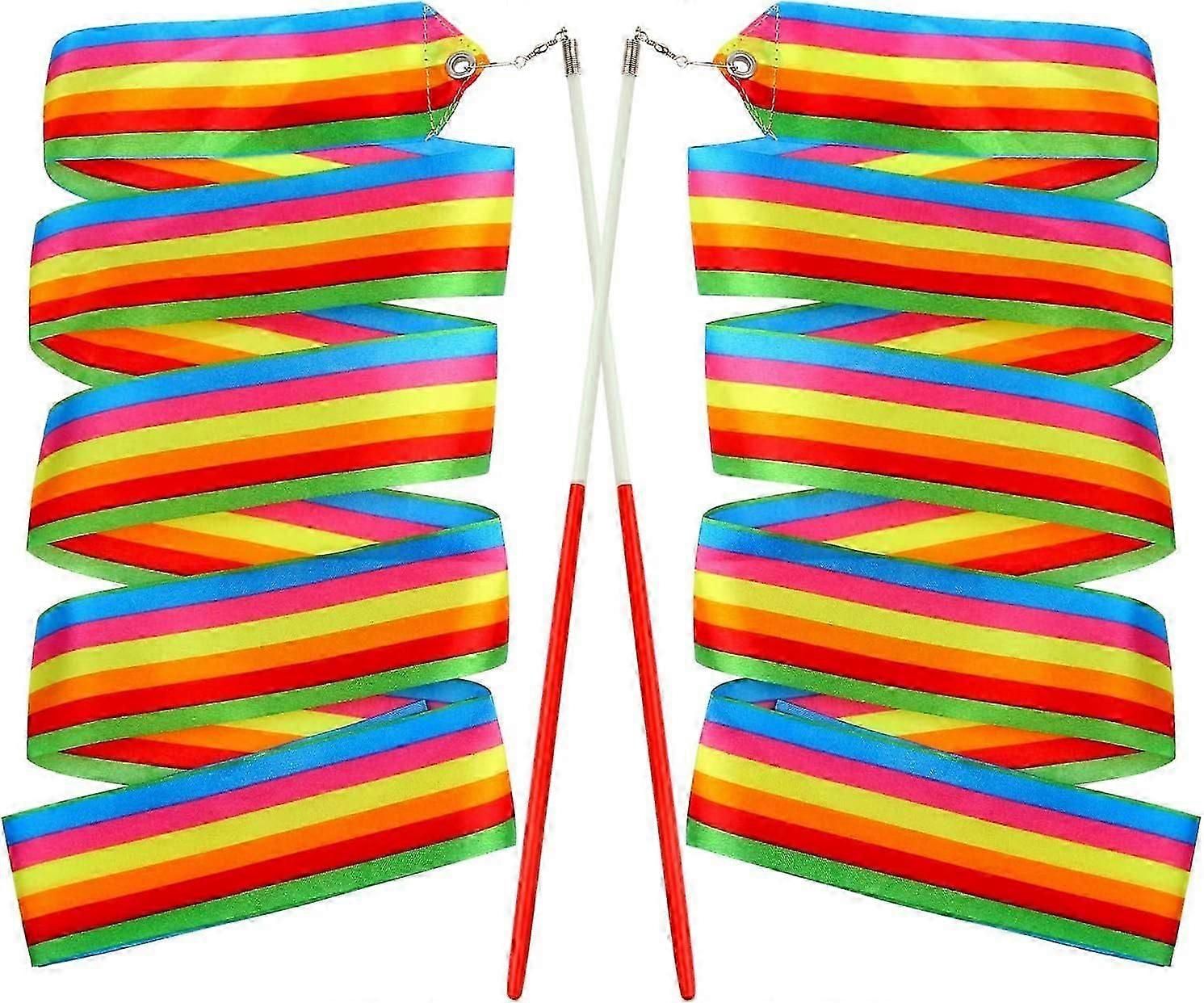 Dance Ribbons Rainbow 2PCS Streamers Rhythmic Gymnastics Ribbon Baton Twirling Wands on Sticks for Kids Artistic Dancing