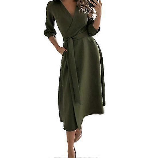 Fall Spring Women Dress A-line Big Swing V Neck Belted Tight High Waist Long Sleeve Pockets Soft Mid-calf Length Party Prom Midi Dress
