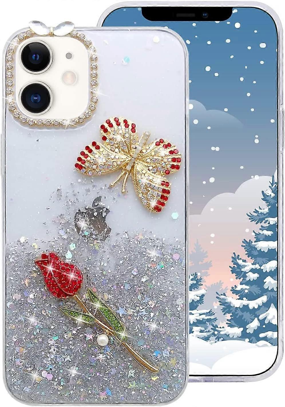 for iPhone 13 Pro Max Bling Diamond Case for Women Girls Luxury 3D Shiny Sparkle Glitter Sequins Rhinestone Butterfly Rose Flower Soft Slim Protective