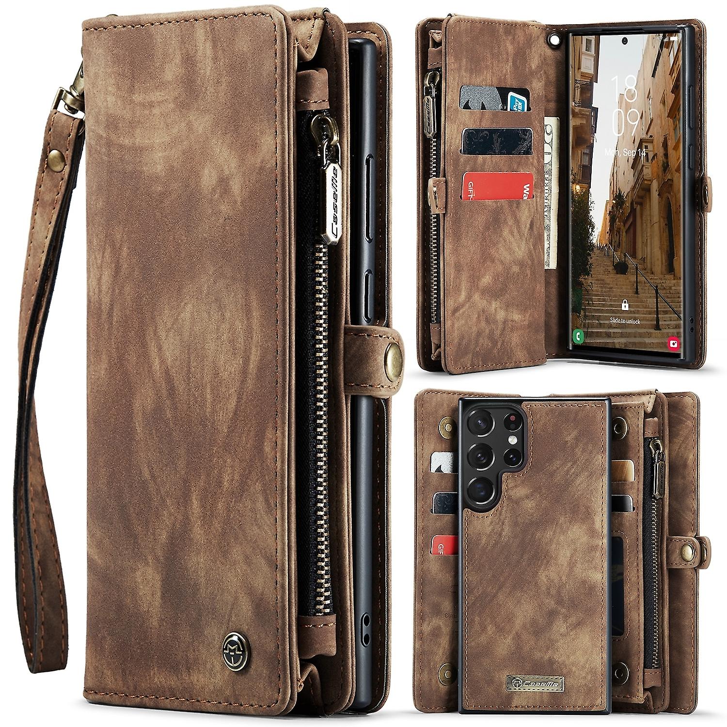 Für Samsung Galaxy S24 Ultra CaseMe Kunstleder Multifunktion Zipper Wallet Tasche Braun