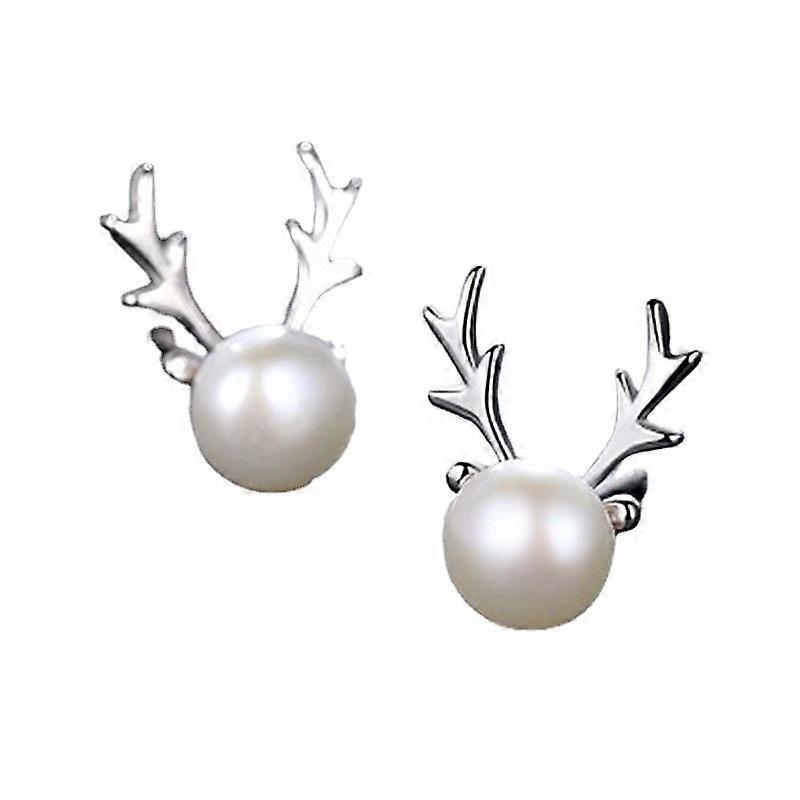 Christmas Reindeer Earrings, Silver Pearl Stud Earrings with Antler Design