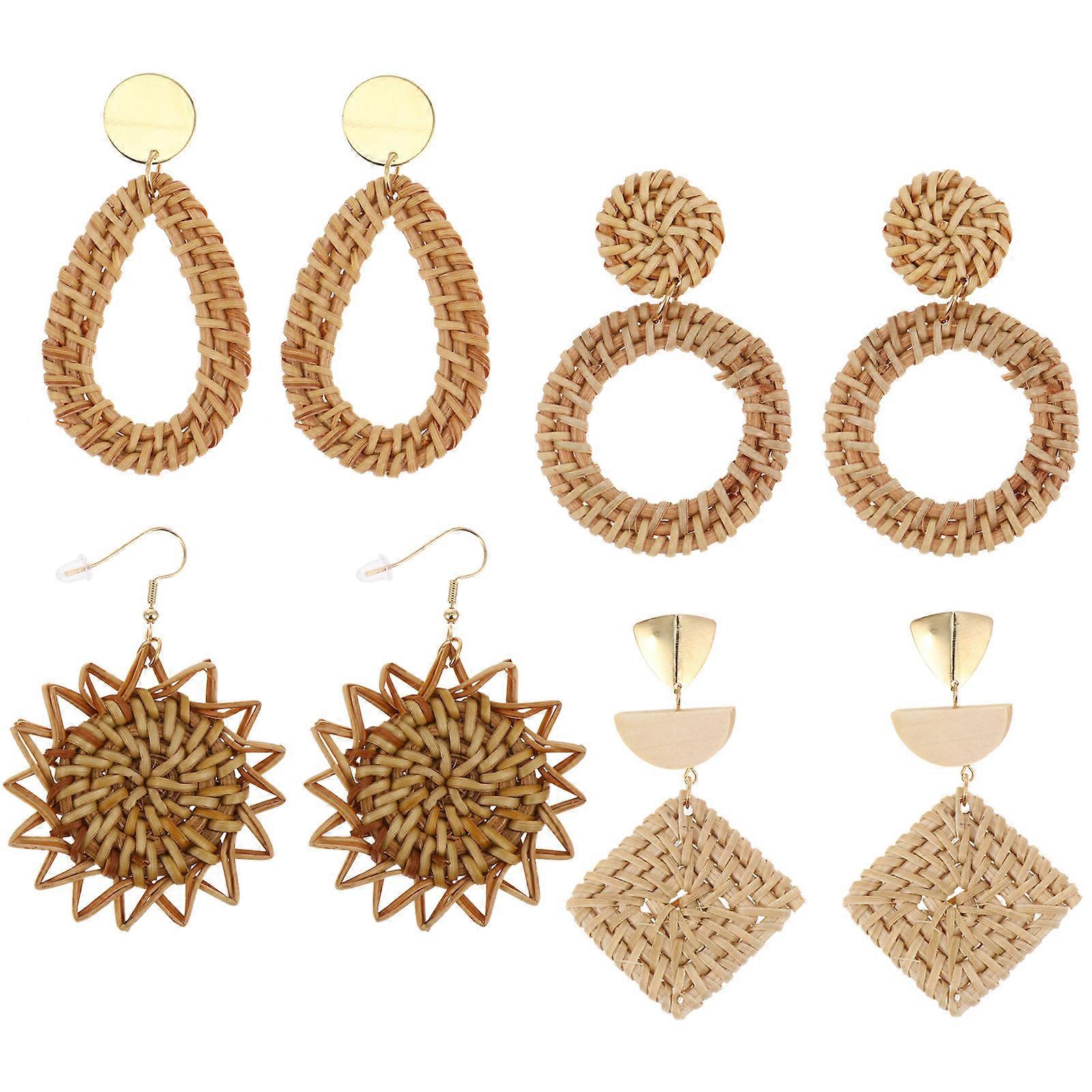 Vintage Design Rattan Earrings 4 Pairs Fashionable Women'S Accessories Round Shape Daily Use