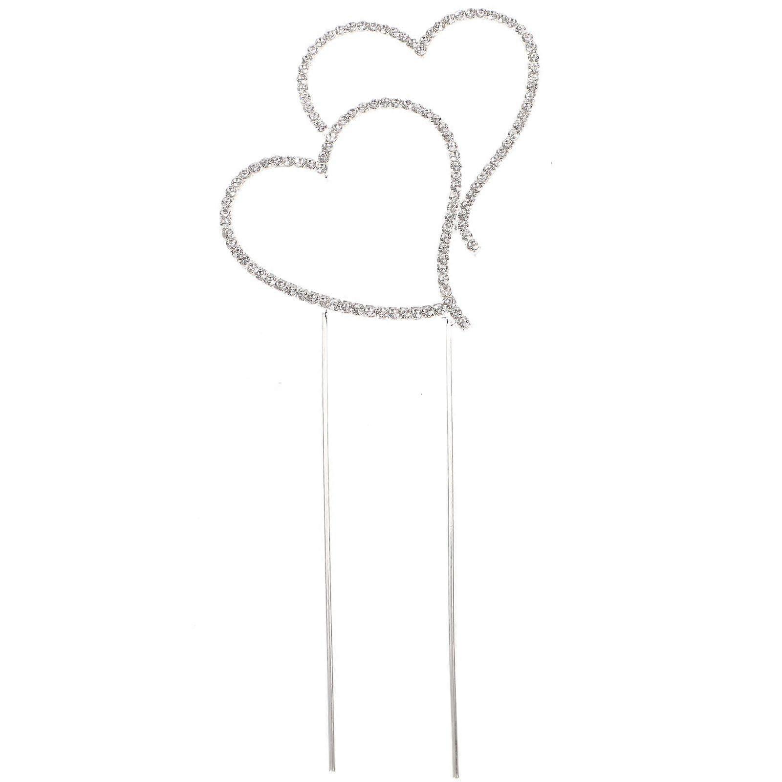 Delicate Sparkling Crystal Rhinestones Double Love Heart Shape Wedding Cake Topper Decoration - Size L (Silver)