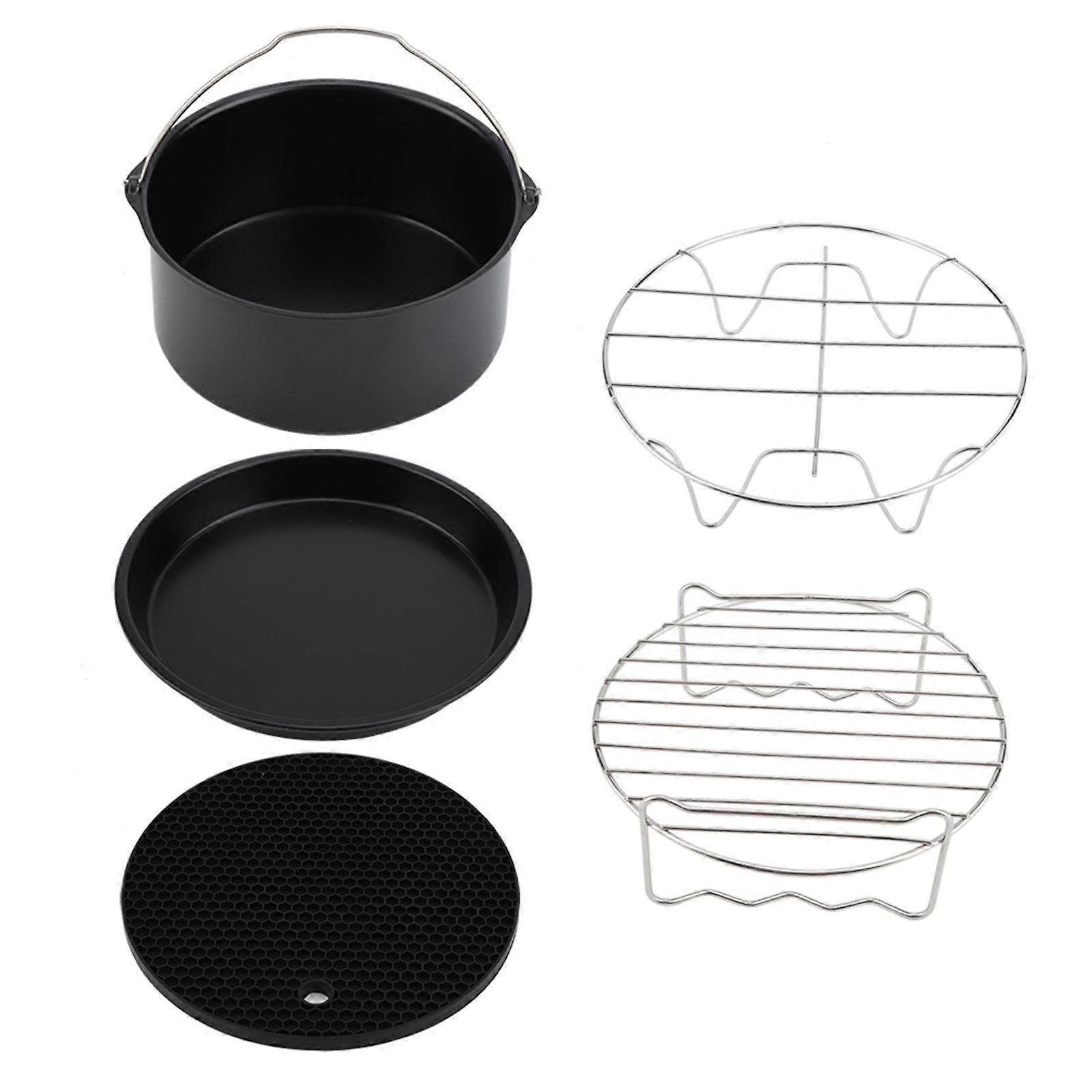 These air fryer accessories are made of quality materials, which is safe and durable to use. Compatible with most air fryer. This kit includes 1 metal holder, 1 skewer rack, 1 cake barrel, 1 silicone mat, 1 pizza pan, which can meet your different cooking needs. Spare your time to make french fries, a pizza or pancakes with the ingredients you loved. _x000D_