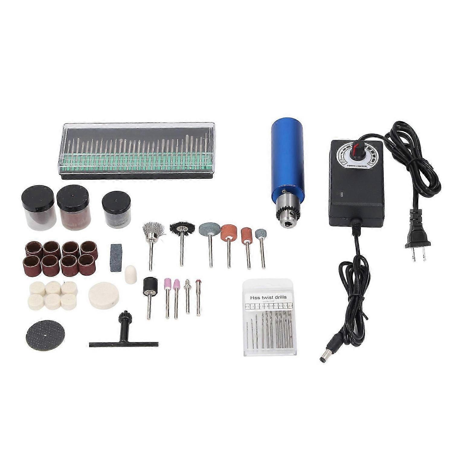 Feature:1. ACCURATE CHUCK: Rotary tool accessories kit with accurate drill chuck, 0.3-4MM grip range, high concentricity steel casting preferred drill chuck2. STRONG POWER: Mini rotary tool kit is long lasting, with strong surging power, possess fast speed, low power consumption, and long life, very reliable3. PORTABLE AND NON SLIP: Rotary tool kit has portable switch, feel good, easy to operate. Metal body with frosted design, non slip, bring comfortable grip experience4. SCOPE OF USE: Mini electric mill can be matched with the corresponding accessories, suitable for wood, metal, stainless steel, ceramics, glass, plastic, wood, acrylic plate, circuit board, thin aluminum plate and other materials of drilling, engraving, painting, marking, trimming, polishing and other functions5. VERSATILE AND PRACTICAL: Mini electric mill adopts low voltage design, all copper motor as the power unit, and is equipped with a variety of grinding drilling accessories to make it a wide range of use. Reasonable structure, which is the preferred tool for users such as manual hobby and jewelry processing lineSpecification:Item Type: Rotary Tool Accessories KitMaximum Speed: 13000 RPMClamping Range: Approx. 0.3 ~ 4mm / 0.01 ~ 0.16inWorking Power: 6-24WColor: Blue.Package List:1 x Electric Grinder1 x Supply Plug1 x Wrench30 x Grinding Needle10 x Drill Bit2 x Diamond Wheel Point3 x Fiberglass Reinforced Cutting Wheel30 x Cutting Wheel42 x Polishing Disc9 x Sanding Belt1 x Belt Mandrel8 x Felt Polishing Wheel2 x Brush1 x Polishing Agent4 x Millstone1 x Trimming Stone1 x Felt Polishing Wheel Mandrel1 x Cutting Wheel and Grinding Disc Mandrel1 x User Manual5 x Storage Box