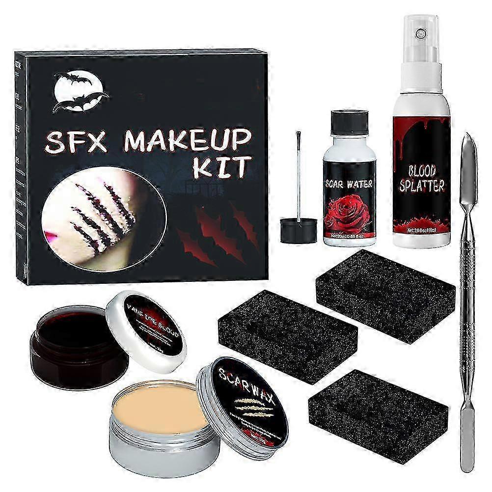 25-26 Halloween Makeup Kit SFX Special Effects Zombie Vampire Skin Wax Fake Blood Gel Scar Water Spray Sponge Silver Scraper for Halloween C