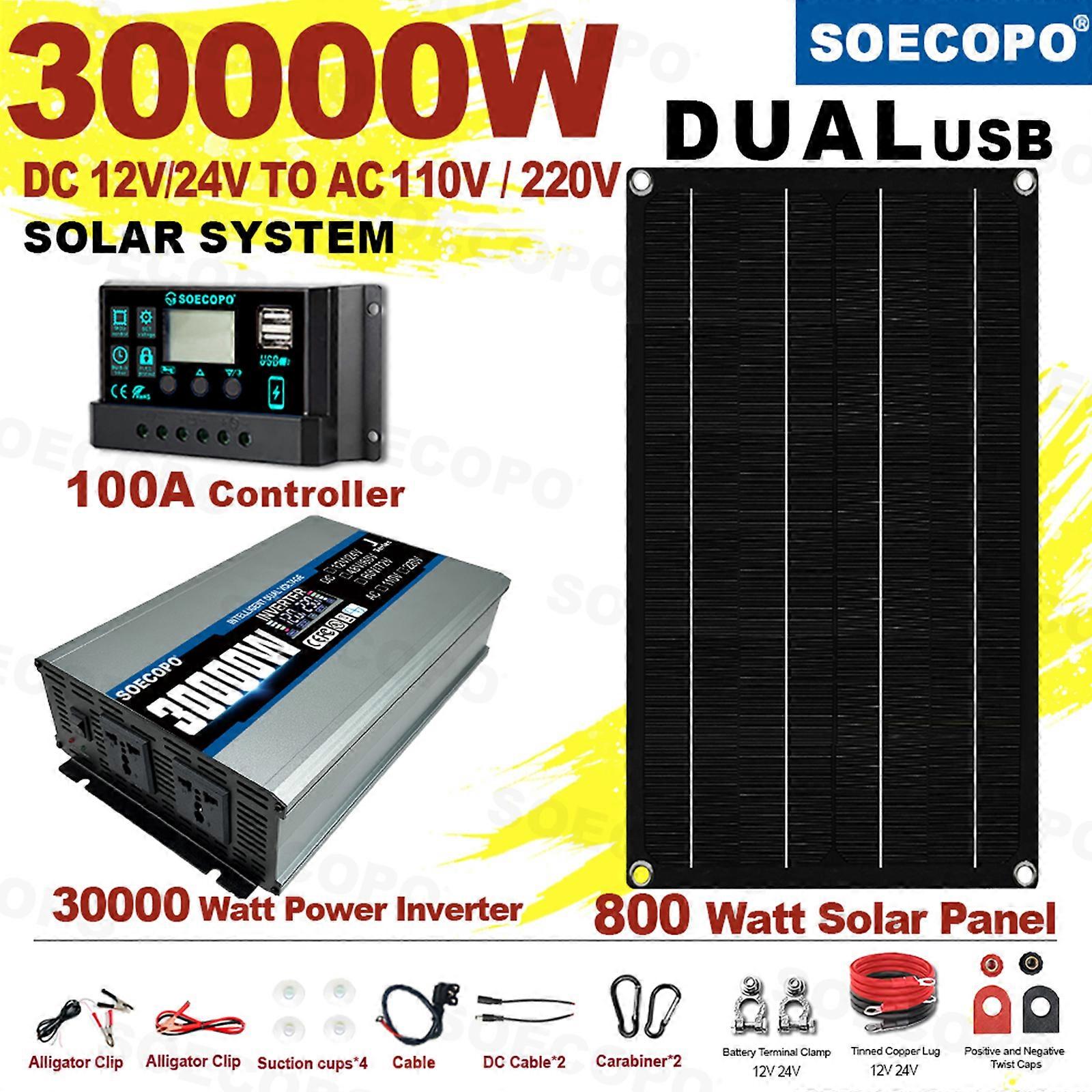 SOECOPO 30000W Complete Solar Power Kit | 800W Panel + 100A Controller + 12V/24V to 110V/220V Inverter