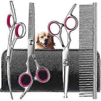 HIGH QUALITY STAINLESS STEEL: The dog shears are made of 4CR titanium coated stainless steel, which is sharp and durable without pulling hair.<br> ROUND TIPS FOR SAFETY: No worry about accidentally poking pets, especially when grooming sensitive areassuch as face, ears, eyes, nose, paws, because our dog grooming shears have rounded end tips.<br> ERGONOMIC DESIGN: The rubber rings on the handle, can avoid harming your fingers and prevent slipping, making it comfortable to hold. It is also removable, for different finger sizes use.<br> ADJUSTABLE AND MUTE: The screw in the middle of the dog cat grooming scissors can be adjusted to loosen or tighten for usage. There is also a silencer pad on the grip so that your pet will not be as scared as electronic clippers.<br> PERFECT PET GROOMING SCISSORS KIT: Pet grooming scissors kit includes 7-inch thinning shears, 7-inch curved scissors, 7-inch straight scissors, grooming comb, cleaning cloth, and stylish black leather case. So it can trim any part of your pet such as body, face, nose, ear, tail, paw etc.