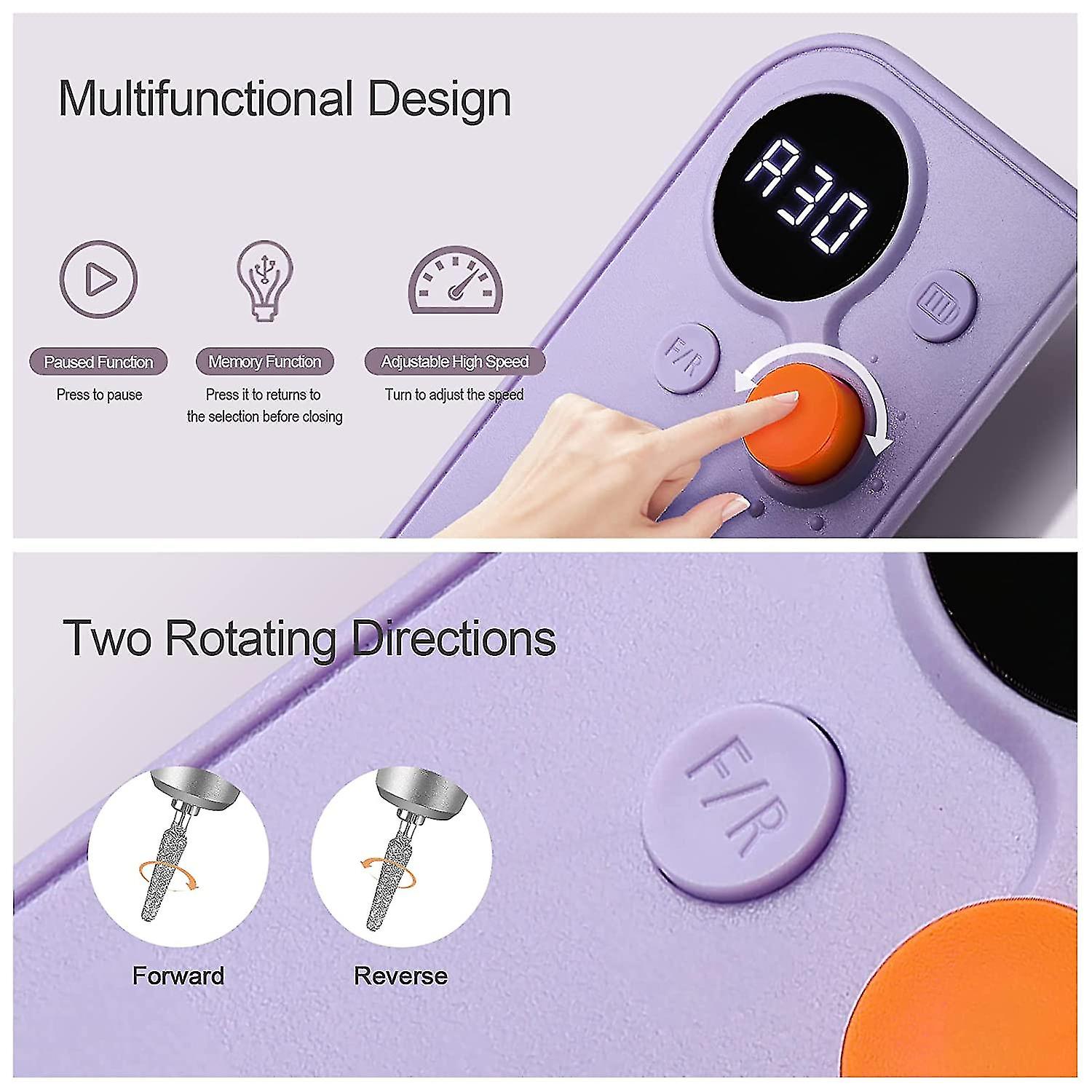Rechargeable nail drillThe nail drill machine has the characteristics of super battery life, which can be used for 8-10 hours after charging in 3.5 hours. The clear screen makes it so much easier to know that how much of a charge it has left. The cordlessdesign of the nail drill means you don't have to do your nails near an outlet Adjustable high speedThe electric nail drill has a variety of variable speed controls,the high speed up to 30000RPM. The design of the rotary button makes it more flexible to adjust the nail grinder speed during manicure, making your manicure more efficientand perfect, saving you time Multifunctional designThe multi-function portable nail drill can be paused and has a memory function, no need to restart, and one key returns to the selection before closing. Press the F/R key to reverse the acrylic nail drill, press it again to returnto forward rotation, and press the battery key to check the remaining power. The simple operation of the nail filer electric makes manicure at home a breeze Efficient heat dissipationThe handle and interface of the electric nail file have cooling holes for quick heat dissipation. Low heat, low vibration, low noise, long-term smooth operation, easy and safe to use, don't worry about affecting others. Andthe nail e-file is easy to operate, both professionals and beginners can easily master it Durable nail drillThe professional nail drill is equipped with a delicate lock drill, which has high compatibility and concentricity, so you don't have to worry about about the nail drill bit falling off. The nail drill kit is stylish and slim. It iseasy to carry it, and comfortable, and powerful. Easily solve the problem of natural acrylic nails, gel polish dip powder nails, and exfoliation of dead skin cells and calluses