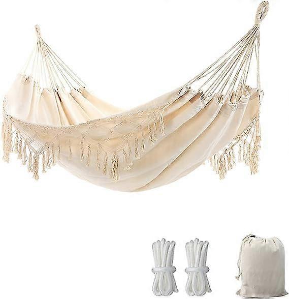 DescriptionLarge macrame hammock: the total length of this hanging hammock (from loop to loop) is 110 inches/280 cm, the bed size is 78.8 x 59 inches/200 x 150 cm. It is larger and wider. And it can hold up to 450 lbs/204 kg. Very perfect for 2 people to use.Comfortable and elegant tassel design: the boho hammock is made of polyester-cotton canvas, soft, breathable and skin-friendly. Traditional handwoven beige tassel, beautiful, elegant and looks great.Wide use: you can hang the macrame hammock anywhere you want, not only in your room, but there is also a large selection outdoors, such as on the beach, to enjoy the sun, decorate the wedding scene. Adults and children who lie in it can feel relaxed, even with sensory needs. Children should use it under the supervision of an adult.Portable and foldable: the Boho hammock comes with two 2 metre nylon straps, so you don't have to search for accessories. The boho hammock comes with 1 drawstring carry bag so you can take it anywhere whether indoors or outdoors. Box contents: 1 x hammock, 2 x 2 m nylon ropes, 1 x carry bag with drawstring in the same