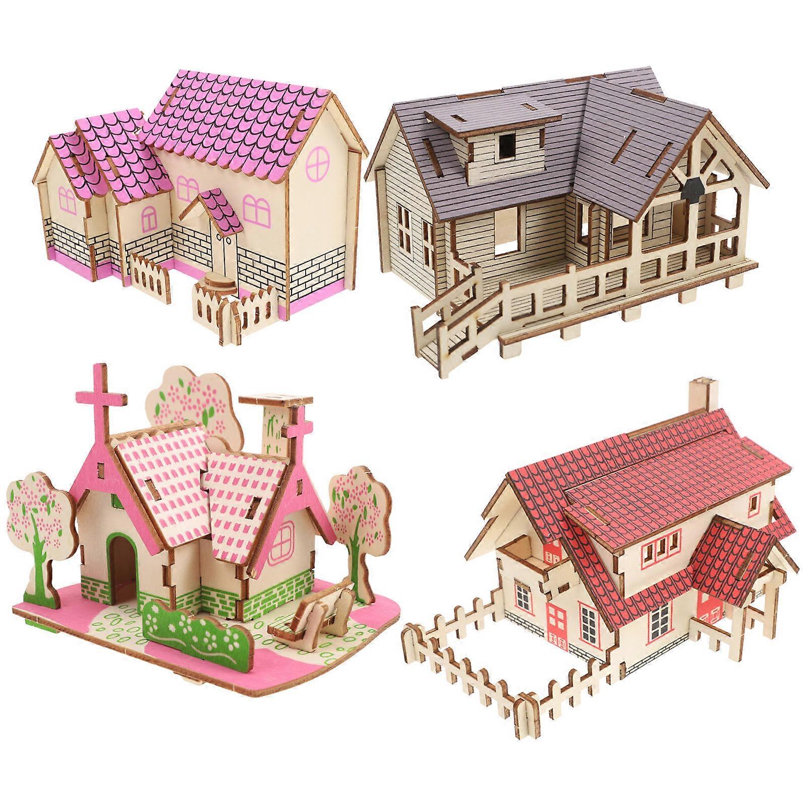 Wooden 3D Puzzle Cabin Model Kit for Home Decoration Assorted Color Wood Educational Toy 4Pcs